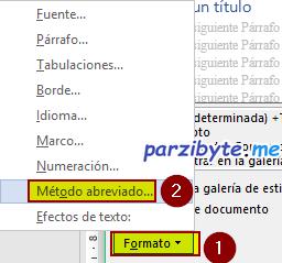 Aparecerá otra ventana en donde, entre otras cosas, habrá un botón que dice Formato. Al hacer click en él, aparece una lista que dice Método abreviado…, lo seleccionamos como se ve en la imagen.