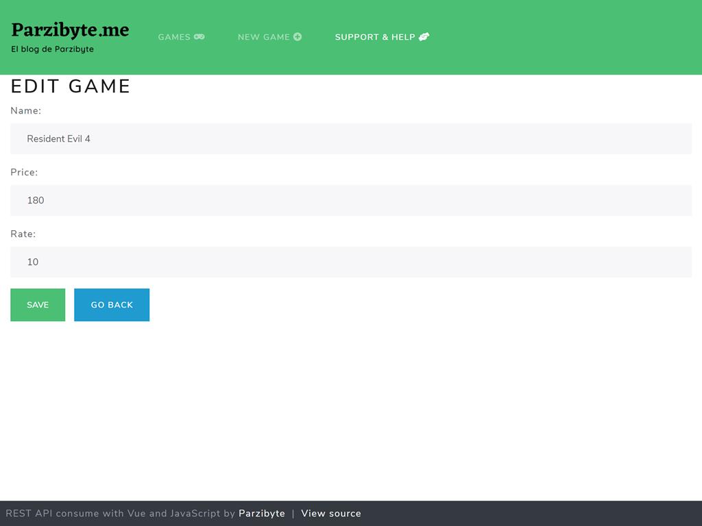 Lo importante aquí es el div que tiene el id app, ya que en ese elemento es en donde va a estar nuestra app de Vue. También fíjate en el formulario y sobre todo en los campos que tienen relacionado cada campo del objeto game (juego) con v-model.