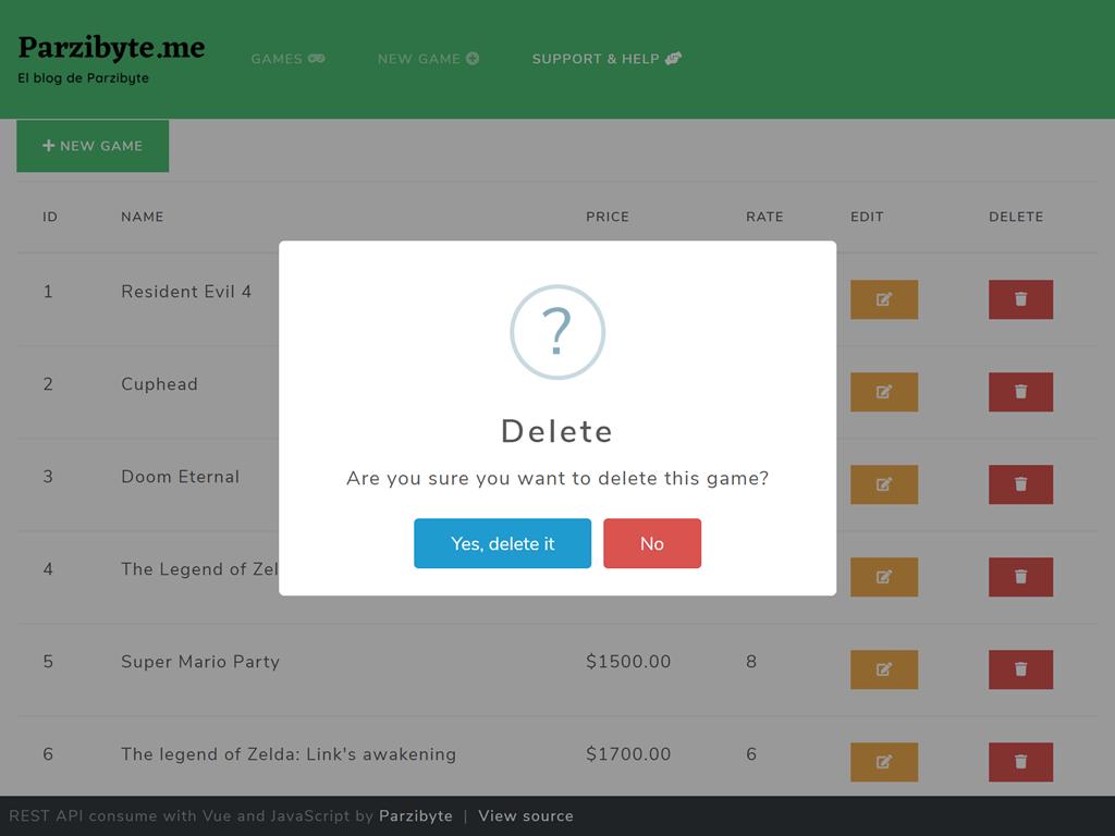 Ya que estamos viendo a la obtención de videojuegos en la tabla, veamos qué sucede cuando se hace clic en el botón de eliminar. Lo que se hace es mostrar una alerta de confirmación usando SweetAlert, y en caso de que el usuario confirme, se hace la petición.