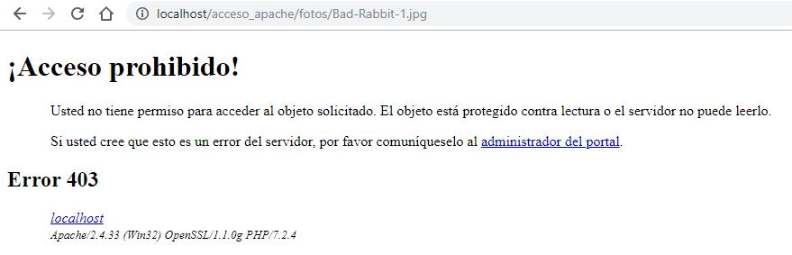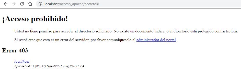En este caso vamos a denegar todo lo de la carpeta “secretos” para que nadie pueda ver ni siquiera el contenido. Aquí la captura de cuando se intenta acceder: