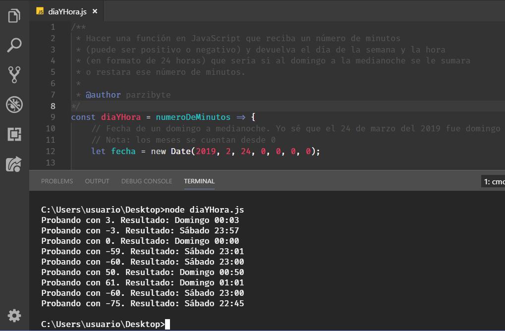console.log(`Probando con ${numeroDeMinutos}. Resultado: ${diaYHora(numeroDeMinutos)}`);