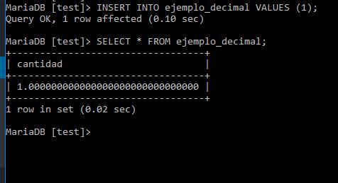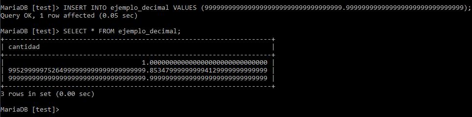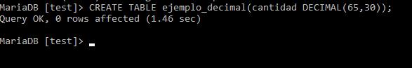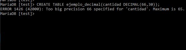 |`DECIMAL(66, 0)`| Error, el máximo para M es 65 |Error, el máximo para M es 65