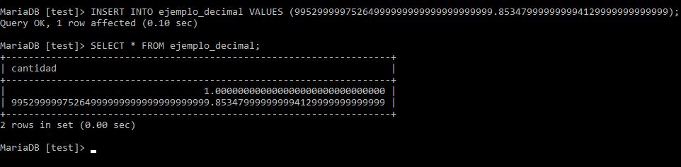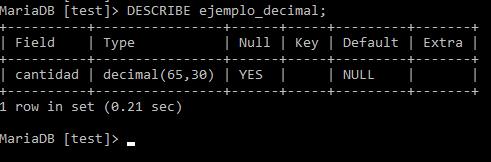 |`DECIMAL(65, 31)`| Error, el máximo para D es 30 |Error, el máximo para D es 30