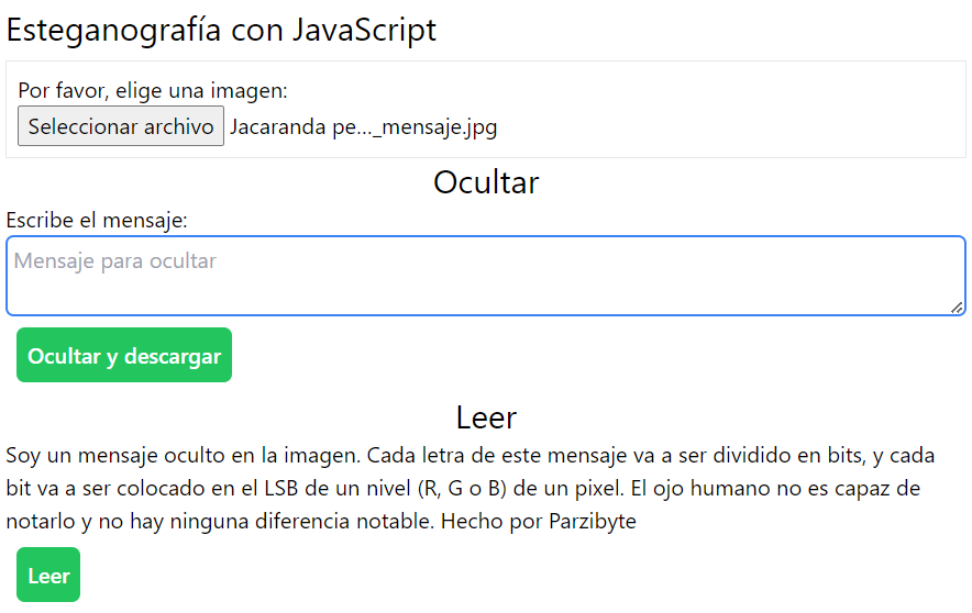 Puedes acceder a la demostración ya mismo en el siguiente enlace sin salir de tu navegador. Prueba seleccionando una imagen y ocultando un mensaje, después regresa a este post para saber cómo fue programado: https://parzibyte.github.io/ejemplos-javascript/esteganografia/