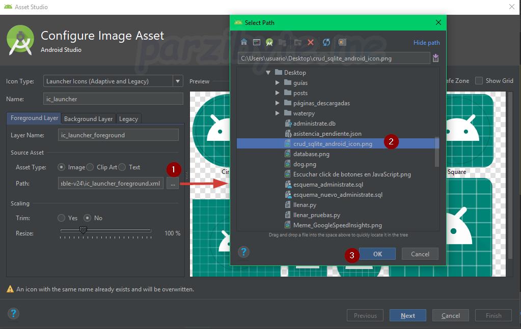 Eso abrirá una ventana con muchos ajustes que veremos más abajo. Por el momento seleccionamos el botón con los tres puntos para seleccionar o buscar una imagen, que será el icono de la app de Android. Una vez encontrada, hacemos click en ella y luego en OK.