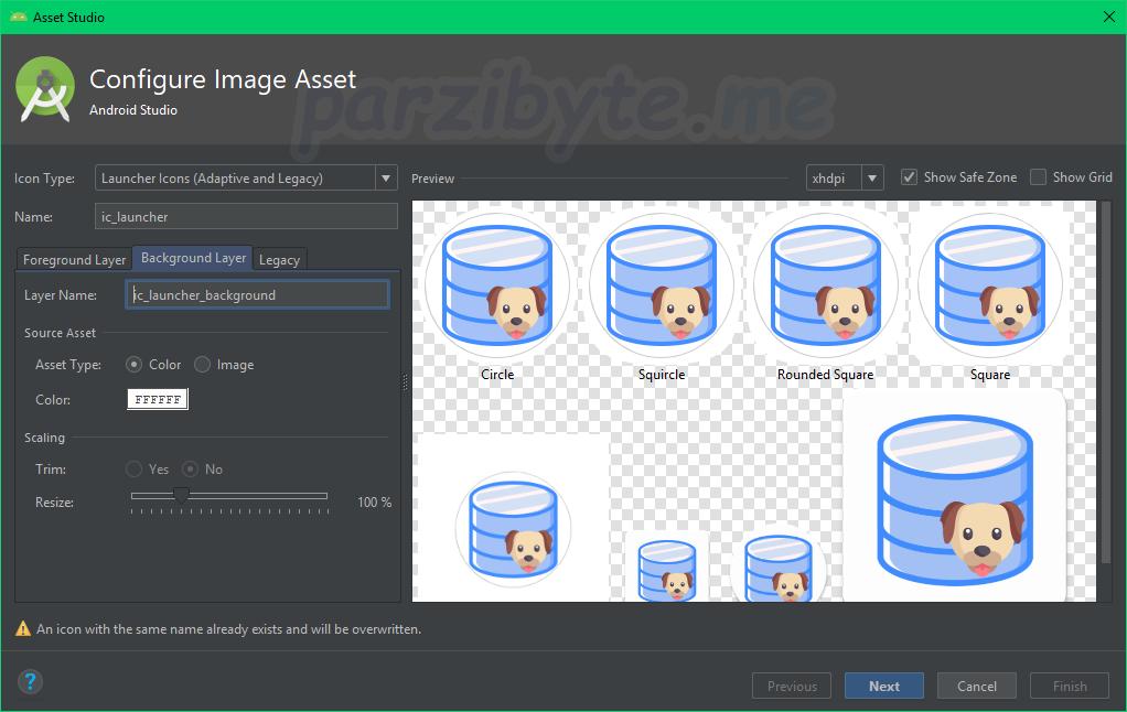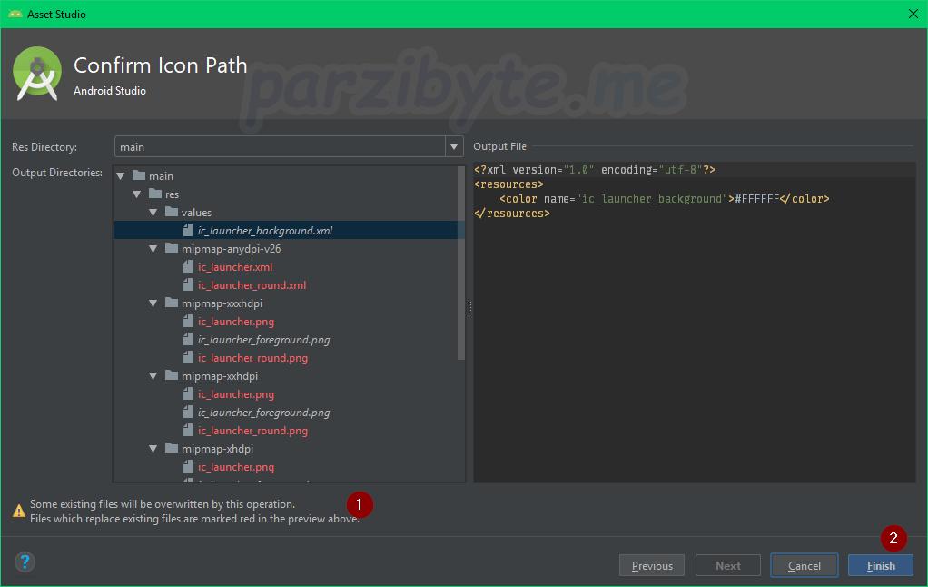La siguiente ventana indica que se van a remplazar algunos valores, incluyendo el antiguo icono de la app; hacemos click en Finish para aceptar el remplazo o en Cancel para cancelar.