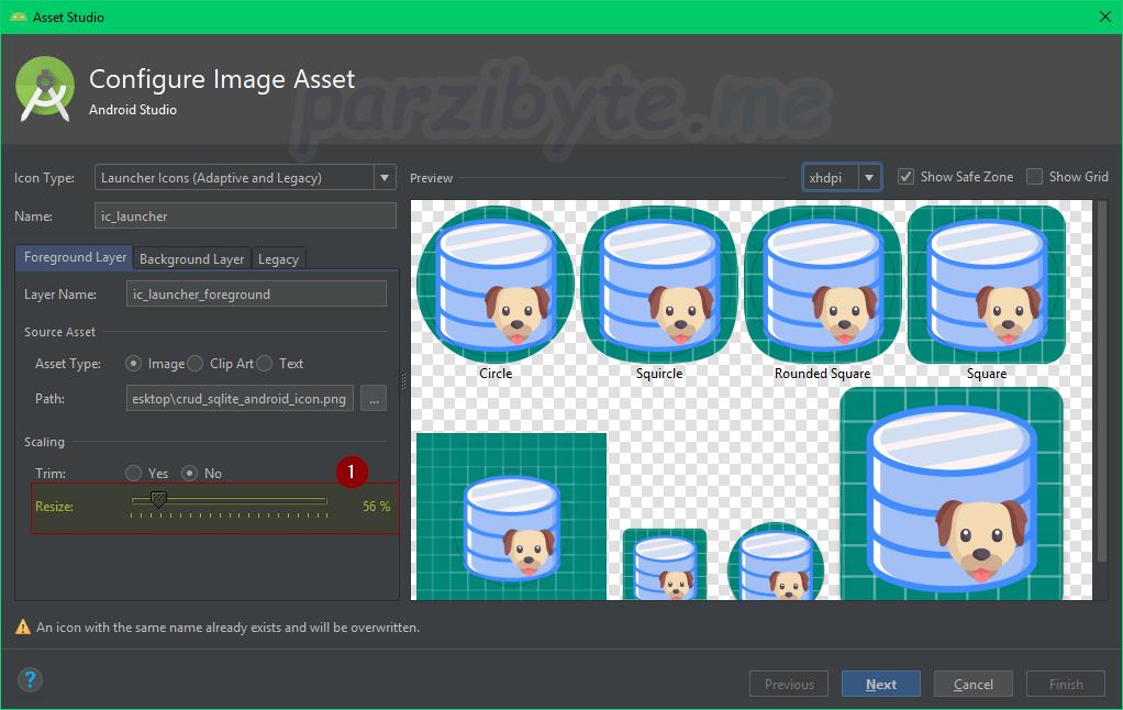 Eso nos dará una vista previa de cómo se verá el icono de nuestra app de Android. Modificamos el slider que dice Resize hasta que quede a nuestro gusto. En mi caso va así: