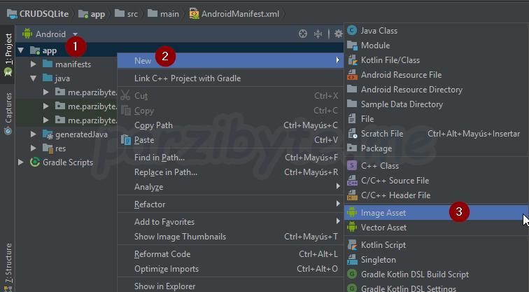 Ejecutamos Android Studio y abrimos el proyecto de nuestra app que estamos desarrollando. Hacemos click derecho en la carpeta que dice app y seleccionamos New > Image Asset como se ve en la siguiente ilustración:
