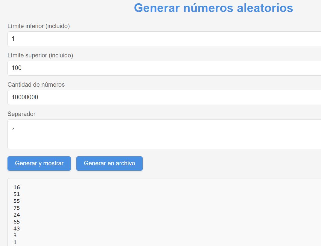 La herramienta para generar un archivo con números aleatorios se encuentra en el siguiente enlace: https://parzibyte.github.io/ejemplos-javascript/generar-numeros-aleatorios/