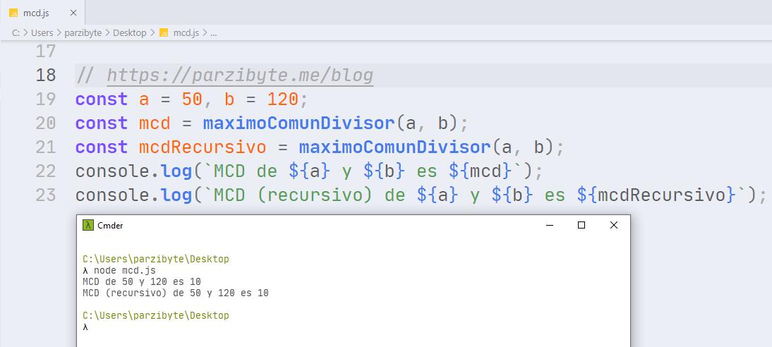 Ya te enseñé ambas funciones, ahora veamos cómo usarlas para obtener el máximo común divisor en JavaScript de dos maneras. El código completo queda así: