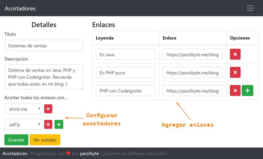 Por ello es que he creado un software web que gestiona enlaces y acortadores, mismo que proporciona una interfaz sencilla para crear “subidas” (así las he llamado), agregar enlaces y acortarlos en el orden que se desee.