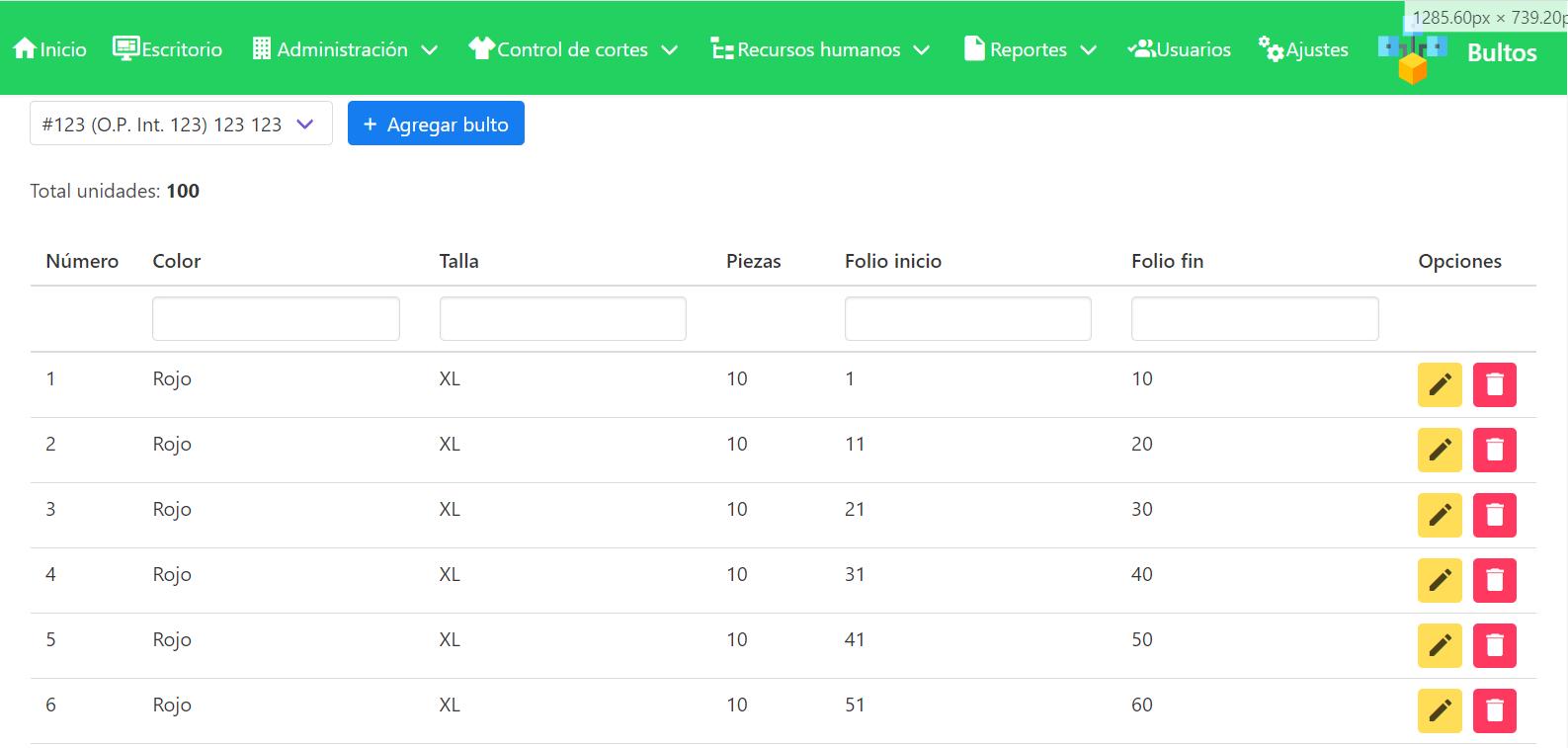 Luego, en el módulo de bultos se registran los folios, tallas y colores de los bultos en los que se reparte el corte completo.