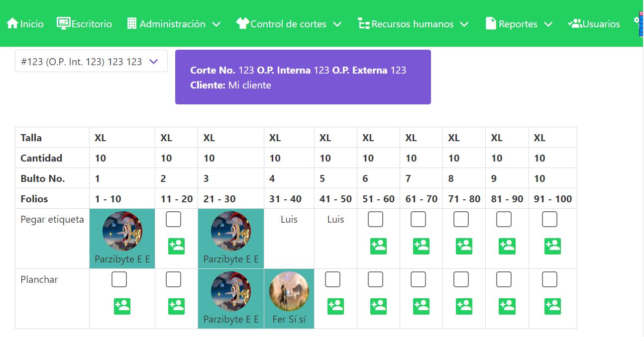 Fíjate en que aparece la talla, cantidad, número de bulto, folio, operaciones y empleados.