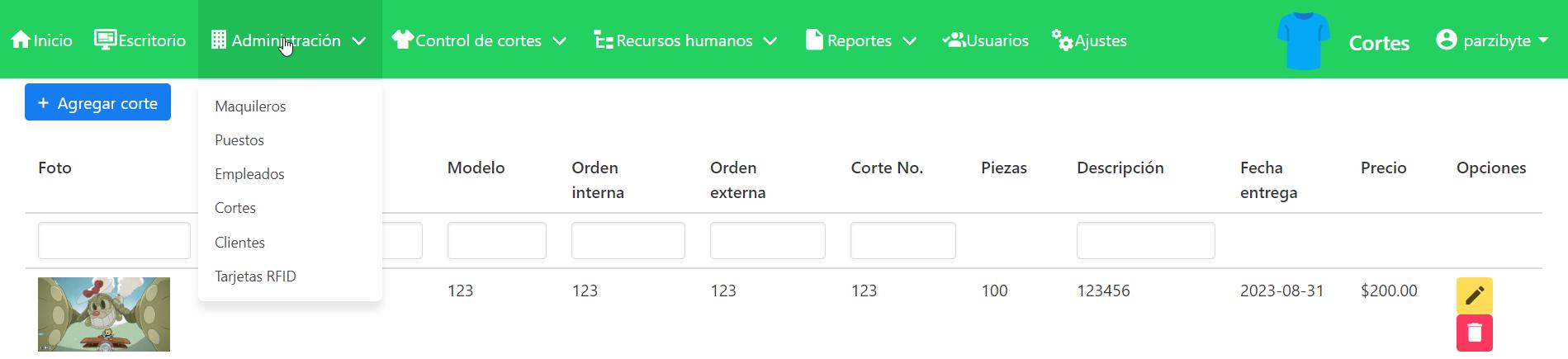 Igualmente se pueden agregar cortes que llevan cliente, estilo, modelo, órdenes de producción, número de corte, piezas, fecha de entrega y precio.