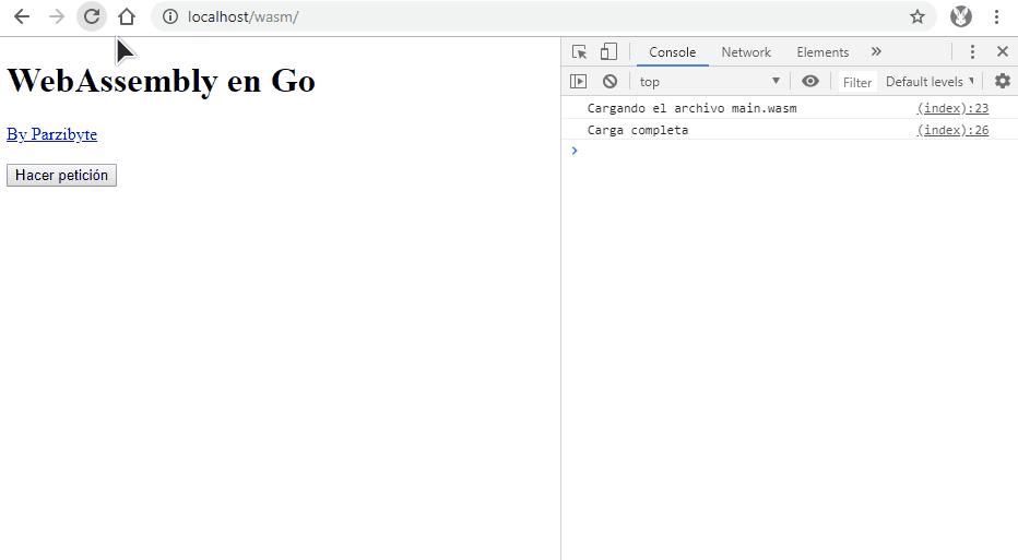 Después de eso visita la web en donde los hayas alojado. yo los puse en htdocs/wasm_basico y se ve así (recuerda abrir la consola con F12):